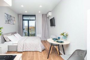 Просторная светлая студия с уютным балконом, идеальным для утреннего кофе или вечернего отдыха с видом на горы! Удобная большая двуспальная кровать.
