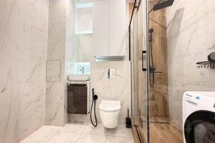 Совмещённый санузел с душевой кабиной, стиральной машиной, феном.