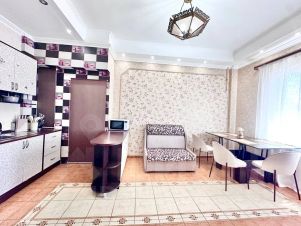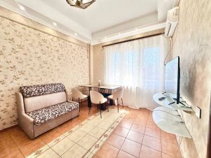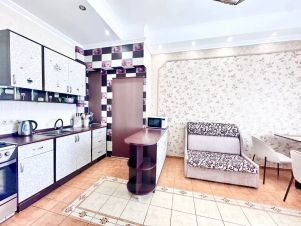 Большая 1-комнатная, кухня-гостиная с диваном и отдельная спальня с кроватью. Два балкона из каждой комнаты. Рядом детская поликлиника, магазины, аптека, рыночек, детсад, школа, автобусная остановка возле дома. До моря 10-12 минут пешком, по ровной дороге.