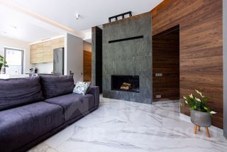 Большая гостиная-столовая с живым камином. Стол из натуральных материалов (мрамор и массив бука) соберет большую семью за вкусным обедом.