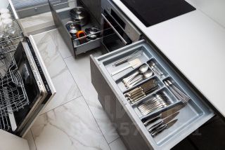 Кухня оборудована современной техникой ВОSСН: посудомоечная машина 60 см, индукционная варочная панель на 4 конфорки, электрическая духовка, современная посуда и столовые приборы;