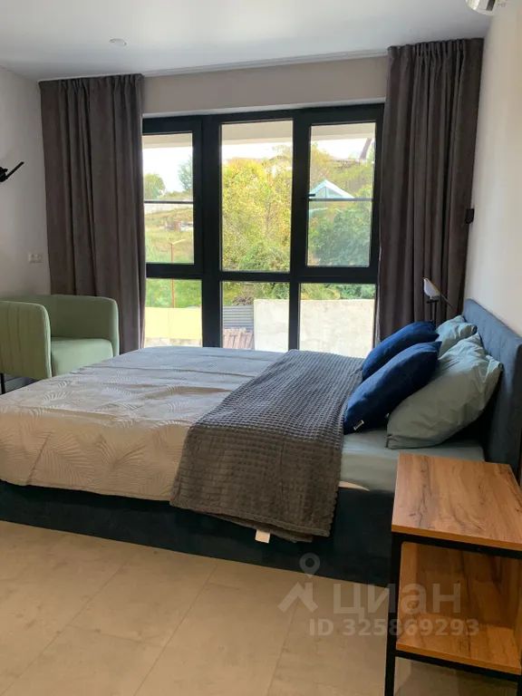 На втором этаже спальня: панорамные окна, двуспальная кровать, кресло кровать, шкаф, телевизор, сплит система, душ, туалет, гладильная доска, утюг, сушилка, wi-fi.