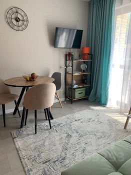 На первом этаже у нас гостиная: шкаф, зеркала, диван, телевизор, обеденная зона, кухня со всей необходимой посудой и бытовой техникой. Мы предусмотрели все для вашего комфортного проживания. Балкон с уличной мебелью, туалет, сплит система, wi-fi.