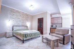 В номере: 2 раздельные полутора-спальные кровати (одна двухспальная) с прикроватными тумбочками, телевизор, диван, два кресла с журнальным столиком, комод, электрочайник, микроволновая печь, кондиционер. Полный санузел с ванной, прихожая, шкаф, зеркало, фен.