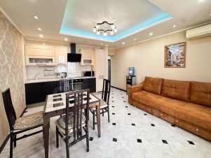 Большой балкон с шикарным видом на море. Двуспальная кровать, угловой диван, 2 сплит-системы, 2жк телевизора, теплый пол, шкафы купе, посудомоечная машина, полный набор посуды, кулер. Квартира полностью укомплектована мебелью и бытовой техникой.