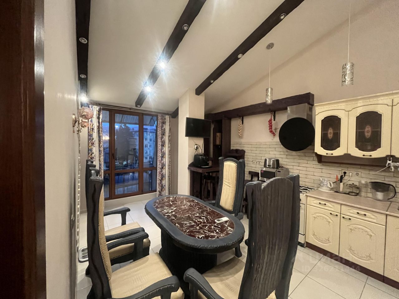 Отделка квартиры дизайнерская природными материалами, внутренне витражное окно авторской работы. Мебель штучного изготовления из массива дерева. Отделка санузлов - итальянская плитка. Все помещения оборудованы кондиционерами.