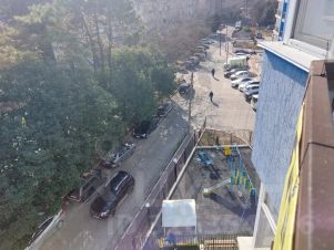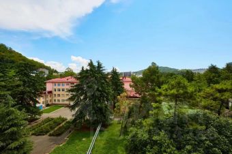Вид с балкона на зелень, хвойные деревья и школьный сад. Очень тихо, в то же время до уникального на побережье пляжа - 15 минут пешком по ровной местности.