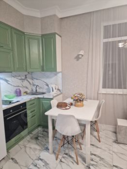 Интерьер квартиры выполнен в современном стиле с евроремонтом. В комнатах и на кухне есть вся необходимая мебель. Квартира оснащена техникой: кондиционером, холодильником, телевизором и стиральной машиной, что обеспечит вам комфортное проживание. Санузел совмещенный, имеется ванна, где можно расслабиться после трудового дня. Окна выходят во двор, поэтому в квартире тихо и спокойно.