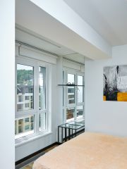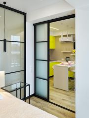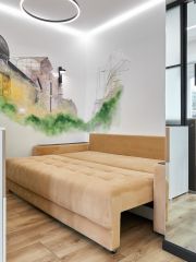 Мебель: кровать (160х200), обеденная зона, кухонная зона (оборудованная), стенка-гардеробная.