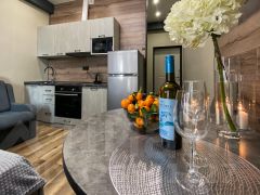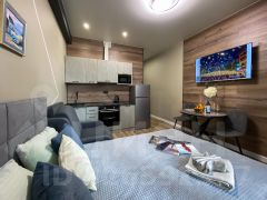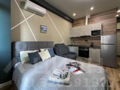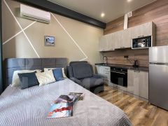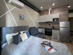 Сдается уютная дизайнерская студия в Дагомысе (первая береговая линия). До моря 3 минуты пешком. Широкая береговая линия, чистое море, множество кафе баров, игровых площадок. Есть все необходимое для жизни. Магазины, остановка в шаговой доступности. До центра Сочи 15 минут на Ласточке (станция рядом), на маршрутке 20-25 минут. Охраняемая территория, есть детская и спортивная площадки, уличные тренажеры.