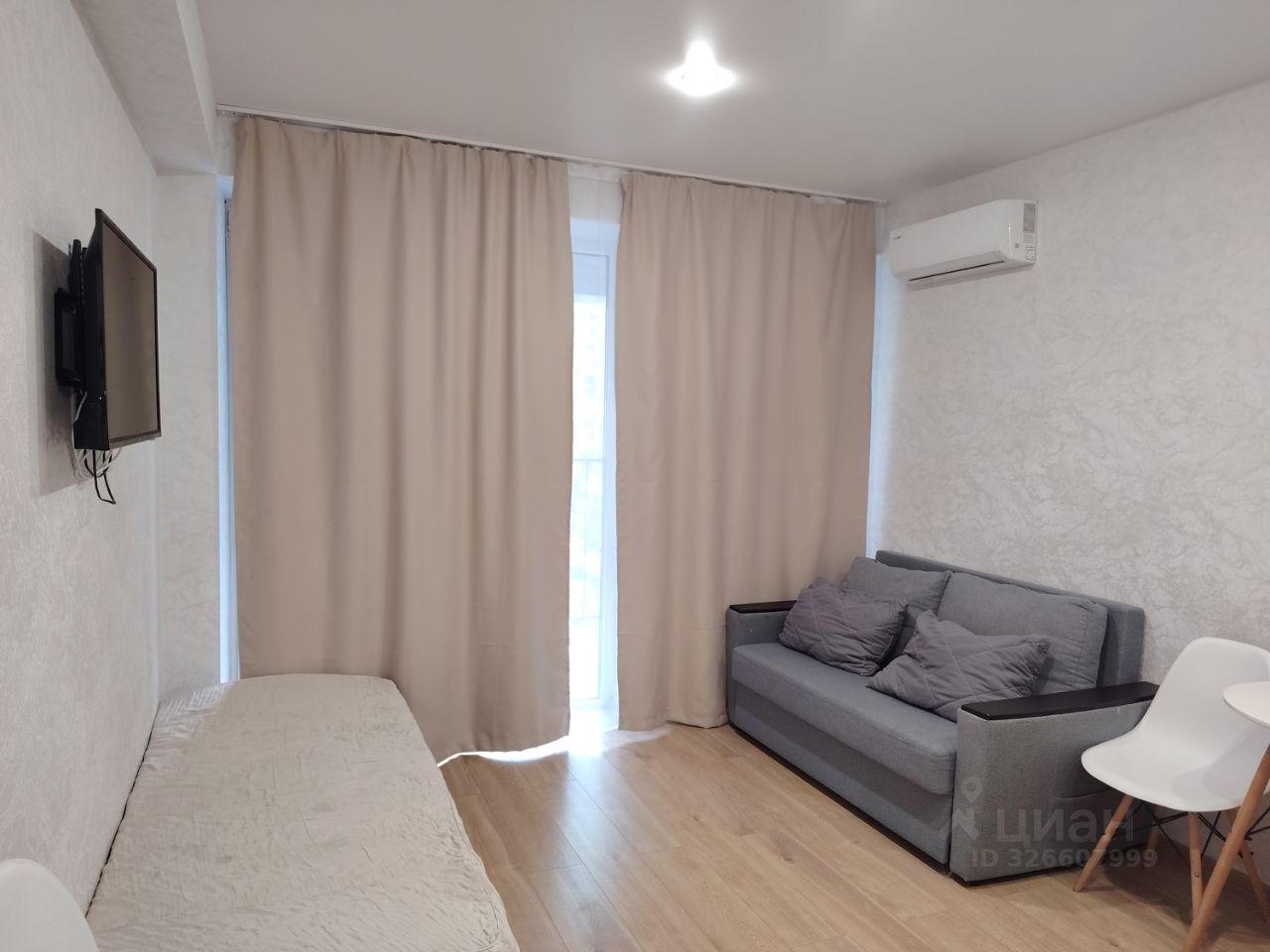 Маленькая студия - малышка с просторным балконом. Диван-кровать + раскладушка позволяет разместиться до 3х человек. В квартире имеется всё необходимое для комфортного проживания. Постельное белье, полотенца, фен, утюг, чайник, микроволновая печь, холодильник,электропечь, посуда, Wi-Fi, смарт тв. На территории комплекса располагаются детские площадки, зона отдыха для гостей, спортивные игровые зоны, открытый бассейн. До пляжа всего 150 метров, на которой расположены лучшие кафе, рестораны и столовые.