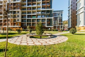 Красивая, благоустроенная территория, где по вечерам включается атмосферная архитектурная подсветка деревьев и ландшафтного озеленения.