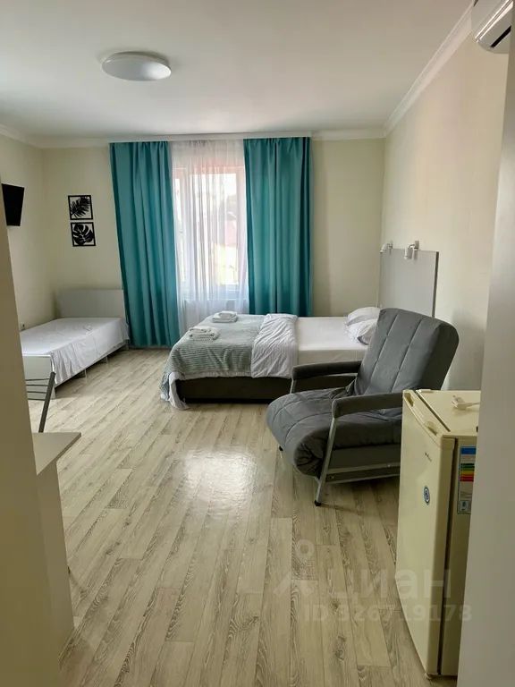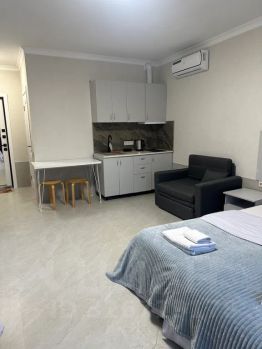 Наш номер достаточно просторный — 30 кв. м., рассчитан на проживание 3-х гостей. В нем расположены 1 двуспальная и 1 односпальная кровати. В номере установлен кухонный гарнитур, есть необходимая посуда, чайник, индукционная печь. Если чего-то не будет хватать, все всегда можно взять на общей кухне в беседке или попросить у нас. Также на территории есть небольшая парковка на несколько машин. Во дворе предусмотрены места для курения, сушки и стирки вещей, а также отдыха.