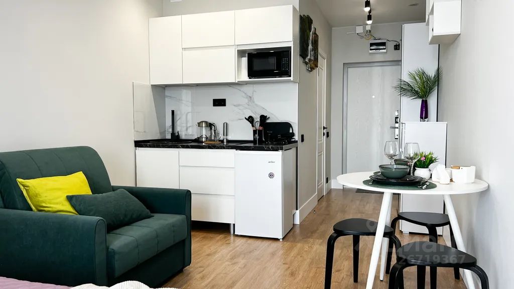 В кухонной зоне: холодильник, микроволновка, варочная панель, чайник, необходимая посуда, столовые приборы и принадлежности