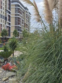 Невероятно красивая территория с прогулочными зонами, скамейками для отдыха, огромным количеством пальм, ароматными цветами, пышными голубыми елями.
