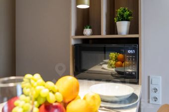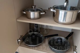Холодильник, микроволновка, варочная панель, чайник, необходимая посуда, столовые приборы и принадлежности