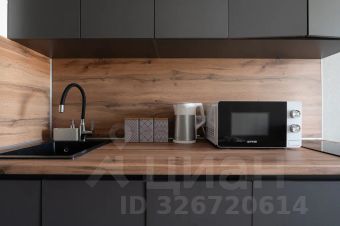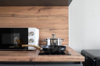 В кухонной зоне: холодильник, микроволновка, варочная панель, чайник, необходимая посуда, столовые приборы и принадлежности