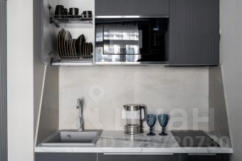 В кухонной зоне: холодильник, микроволновка, варочная панель, чайник, необходимая посуда, столовые приборы и принадлежности