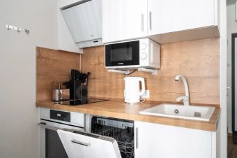 В кухонной зоне: холодильник, микроволновка, варочная панель, чайник, необходимая посуда, столовые приборы и принадлежности, духовой шкаф, посудомоечная машина