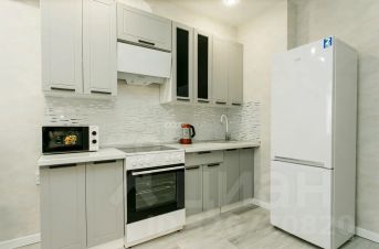 Просторная светлая кухонная зона с выходом на балкон оснащена бытовой техникой.