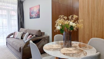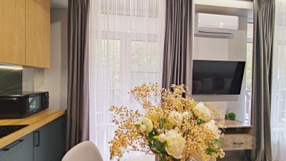 Мы позаботились и создали атмосферу тепла и уюта с нежными оттенками, добавили приятные на ощупь ткани и точечное освещение. Каждая деталь продумана для вашего удобства и незабываемого отдыха. Кухня оборудована всей необходимой посудой и современной техникой, позволяющей легко готовить любимые блюда