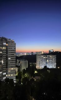 В квартире панорамные окна и высокие потолки, великолепные виды на море, дендрарий, центр города, Кавказские горы, гранд-отель "Жемчужина", санаторий "Светлана", вечерние закаты над морем, красивый ночной Сочи.