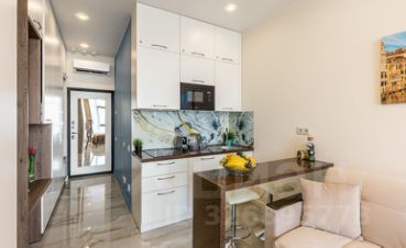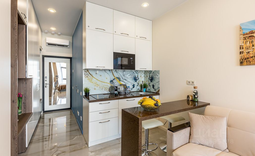 Кухонная зона с встроенным холодильником, микроволновой печью, столовыми принадлежностями. Консоль с барными стульями.