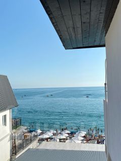 Апартаменты состоят из 2-х комнат, разделенные аркой. В одной из комнат двуспальная кровать и диван в другой раскладной диван. Собственных 2 балкона со столиком и стульчиками с видом на море. Собственный санузел с душем.