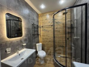 В санузле душевая кабина с тропическим душем, места для хранения, зеркало с подсветкой, полотенцесушитель, стиральная машина.