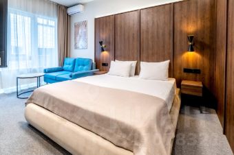 Номер категории Делюкс выполнен современном дизайне с двуспальной кроватью, диваном и балконом. Площадь номера 24 квадратных метра. Спальные места в номере представлены: широкой двуспальной кроватью King size и двухместным диваном-кроватью. Номер подходит для комфортного размещения до 4 гостей. В номере есть: Wi-Fi, холодильник, сплит-система, управление температурой обогрева в помещении, TV с функцией Smart, стол, чайная станция (чайник, чай, сахар), фен, утюг, сейф. Номер оснащен собственной ванной комнатой с душем, туалетом и косметическими принадлежностями.