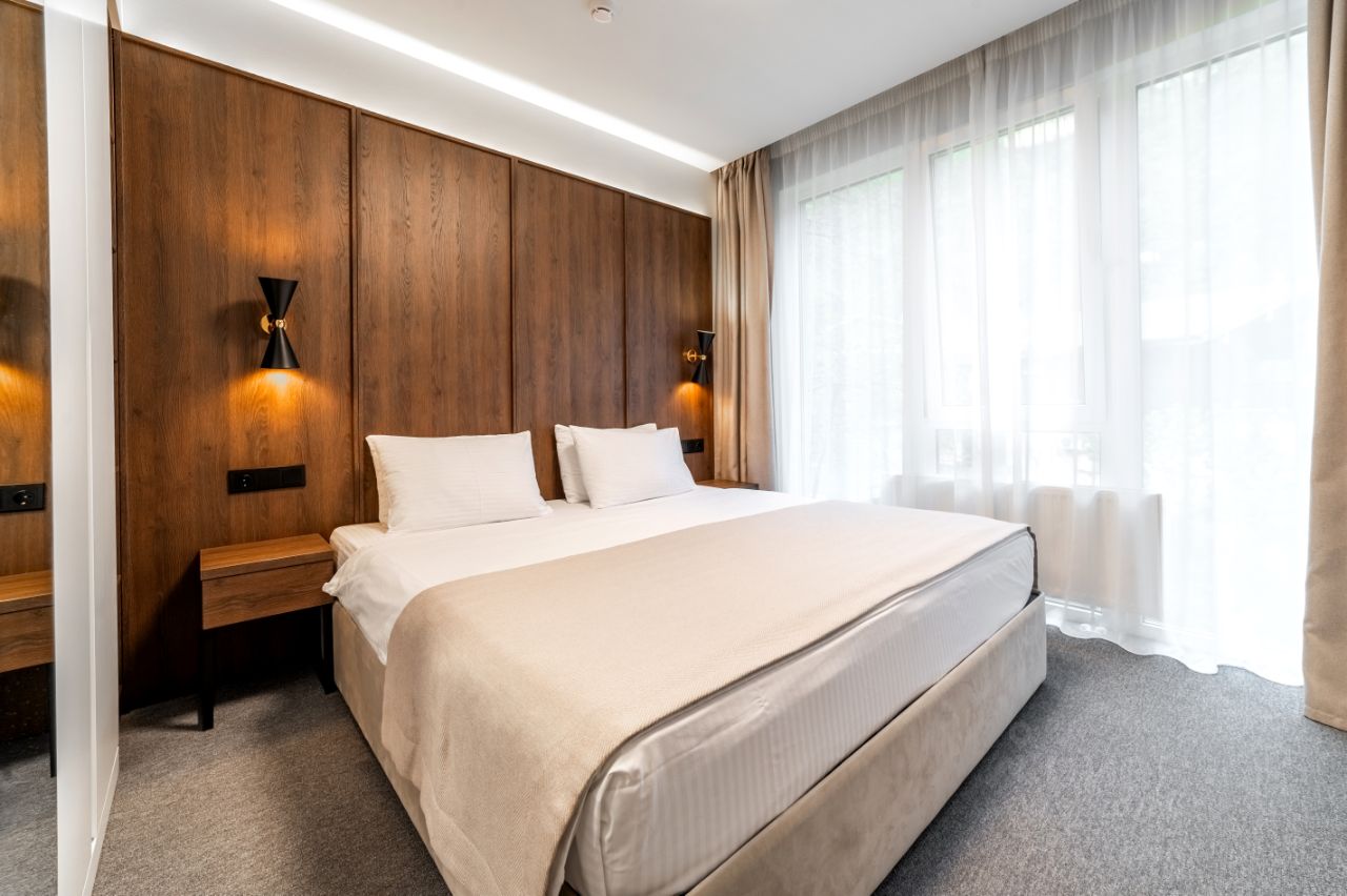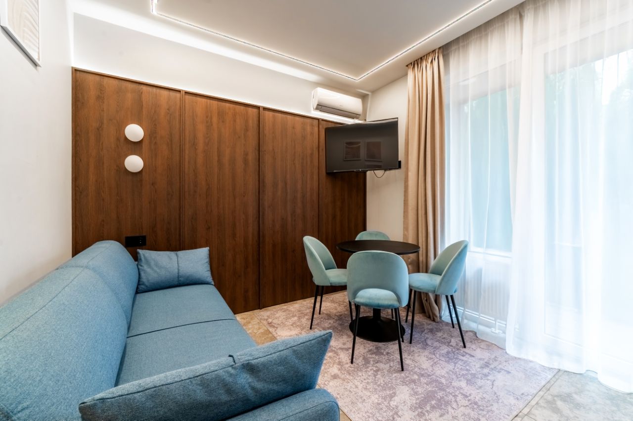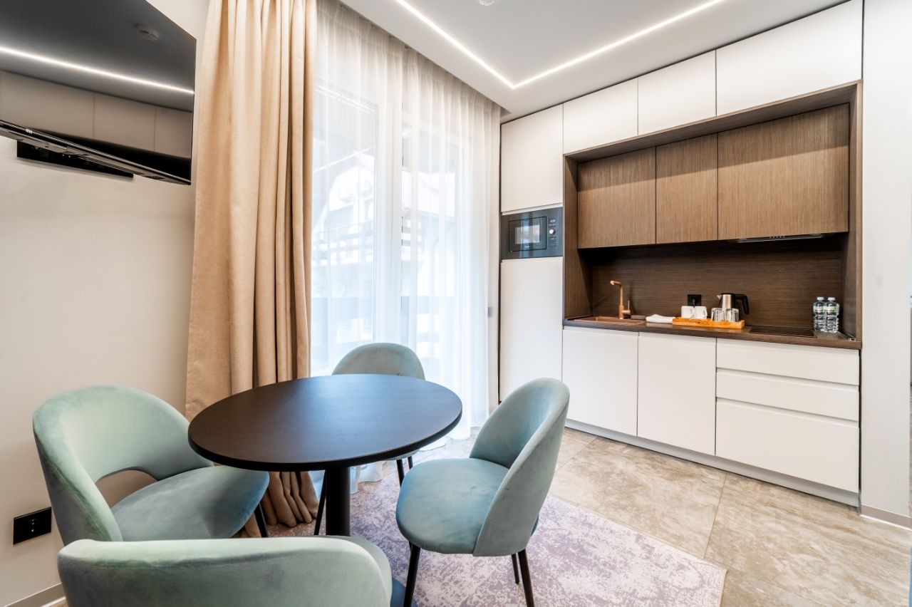 Новые апартаменты с стильным дизайном состоят из отдельной спальни и гостиной с балконом площадью 36 квадратных метров, из которых 5 кв.метров - площадь балкона. Спальные места в номере представлены: широкой двуспальной кроватью King size и двухместным диваном-кроватью. Апартаменты подходят для комфортного размещения до 4 гостей. Номер оснащен гостиной и обеденной зоной, которая совмещена с кухней.