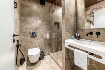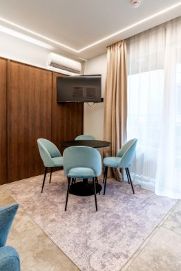 В апартаментах есть: Wi-Fi, варочная панель, СВЧ, холодильник, сплит-система, управление температурой обогрева в помещении, TV с функцией Smart, обеденная зона, чайная станция (чайник, чай, сахар), фен, утюг, сейф. Апартаменты оснащены собственной ванной комнатой с душем, туалетом и косметическими принадлежностями.