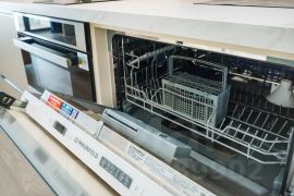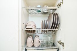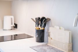 Полностью оборудованная кухня с посудой, посудомоечной машиной, утюгом, гладильной доской и феном.