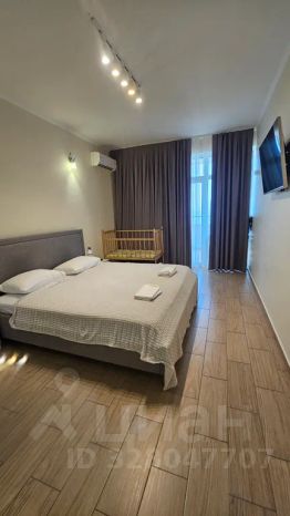 В спальне потрясающий вид на море, панорамное окно с выходом на балкон, большая двуспальная евро кровать, плоский смарт телевизор, шкаф-купе, трюмо с хранением косметики и парфюмерии.