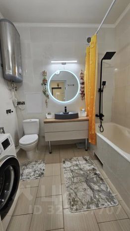 Просторная ванная комната, стиральная машина, интерьерная мебель, бытовая химия, средства гигиены и прочее.