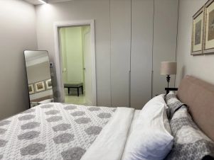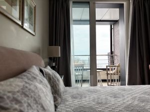 Спальня: удобная кровать с высоким ортопедическим матрасом, вместительный шкаф, панорамное окно с видом на море.