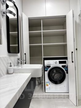 Ванная комната: просторная ванна, стиральная машина, фен, комплект полотенец и косметических средств.