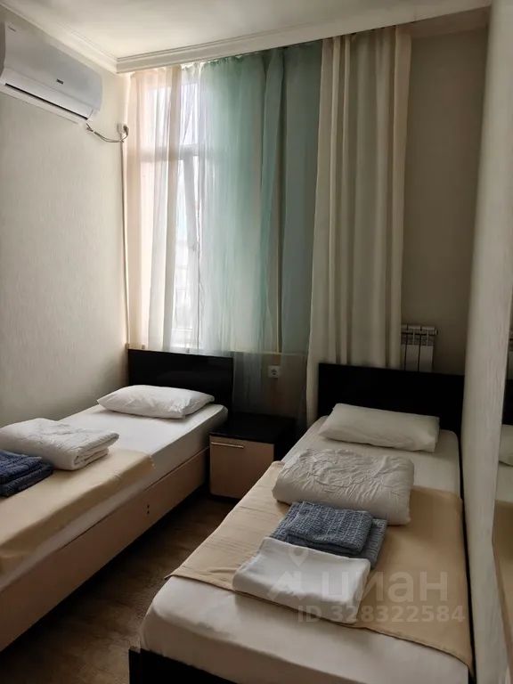 Двухместный номер с общим санузлом, который находится рядом с дверью. В комнате телевизор, кондиционер, холодильник, шкаф для одежды. Есть стиральная машина, гладильная доска с утюгом. На этаже оборудованная кухня. На первом этаже столовая (очень вкусно готовят). До моря 2 мин пешком. Рядом магазины, бутики и аптеки.