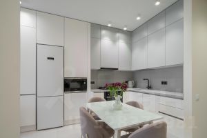Просторная кухня-гостиная с диваном, телевизором и всей техникой BOSH.