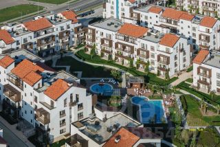 Евродвушка 56 м² в комплексе Альфа Сириус Парковый. Угловая, очень светлая — много окон, включая панорамные на балконе. Из каждой комнаты — виды на горы, внутренний двор с пальмами и бассейнами