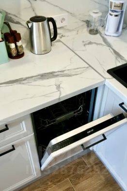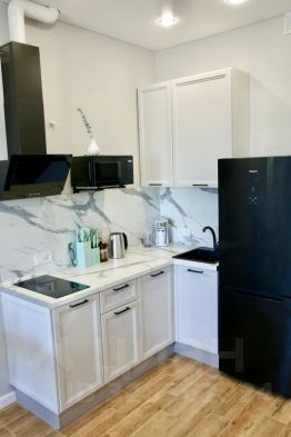 В кухонной зоне: большой холодильник с морозильной камерой, варочная панель, СВЧ-печь, чайник, посудомоечная машинка, кофеварка.
