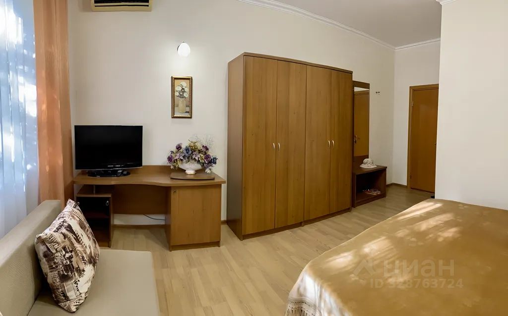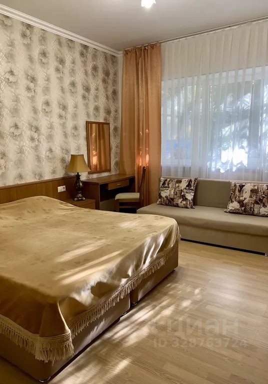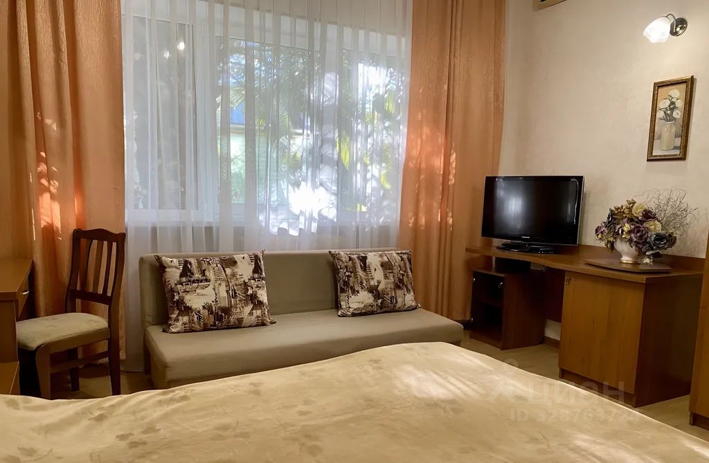 Уютный просторный светлый номер без балкона с большим окном выходящим на нашу пальму. В номере большая двуспальная кровать либо две односпальные и хороший удобный раскладной диван евро-книжка (140 на 200). Также в номере холодильник, телевизор и кондиционер, различная мебель.