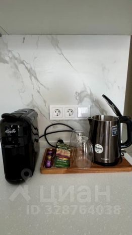 Полностью оборудованная кухня: плита, холодильник, чайник, кофемашина, посуда.
