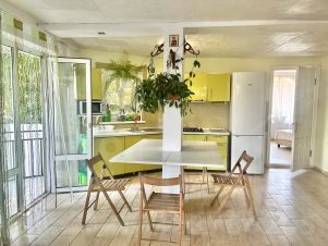 Главная фишка — кухня-балкон, которую мы обожаем! Это самое душевное место в квартире. Здесь всегда есть лёгкий сквозняк (спасение в жаркий летний день!), а сам балкон утопает в цветах. Представьте: утро, чашка кофе, свежий ветерок из Дагомыса, зелень вокруг... Идеальное начало дня перед выходом на море. А вечером — посиделки с чаем или ужин под звёздами.