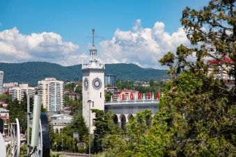до ЖД вокзала 3 минуты пешим шагом. Каждые 30 минут ходят ласточки в Адлер, Аэропорт и Красную Поляну.