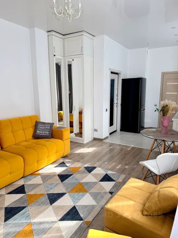 Стильный декор и продуманные детали интерьера: геометрический ковёр, яркие пуфы, изысканная люстра — всё создано для вашего комфорта.