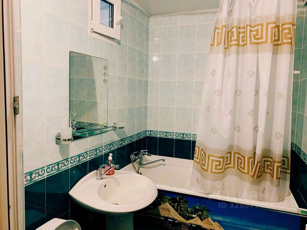 В ванной комнате: ванна, раковина, унитаз, зеркало, полотенца, туалетные принадлежности. Вид на город.