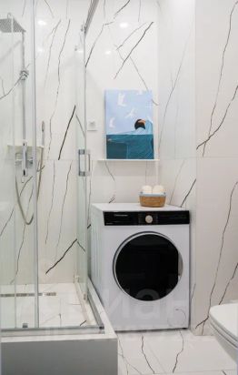 Пространство светлое, с голубыми акцентами и ощущением воздуха.