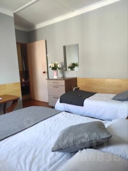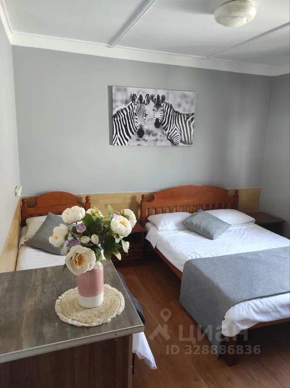 В данной комнате двухспальная и односпальная кровати, телевизор, вентилятор, комод для одежды, столик и стулья для отдыха.