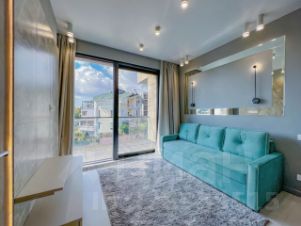 Гостиная, совмещённая с кухней, — сердце апартаментов. Просторная зона отдыха с элегантным раскладывающимся диваном (полноценное спальное место для двоих) идеальна для семейного отдыха или встреч с друзьями.